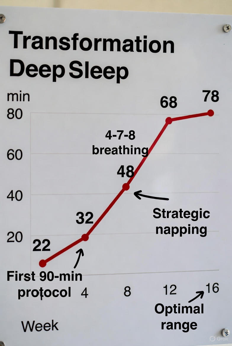 The first 90-minute protocol taught me to protect my deep sleep window. Going to bed at 10 PM felt impossible—there was always more to do. But the data proved: Those first 90 minutes after falling asleep are GOLD. I was getting 18 minutes of deep sleep before. After protecting that window? Thirty-eight minutes. Then forty-eight. Then sixty-eight.